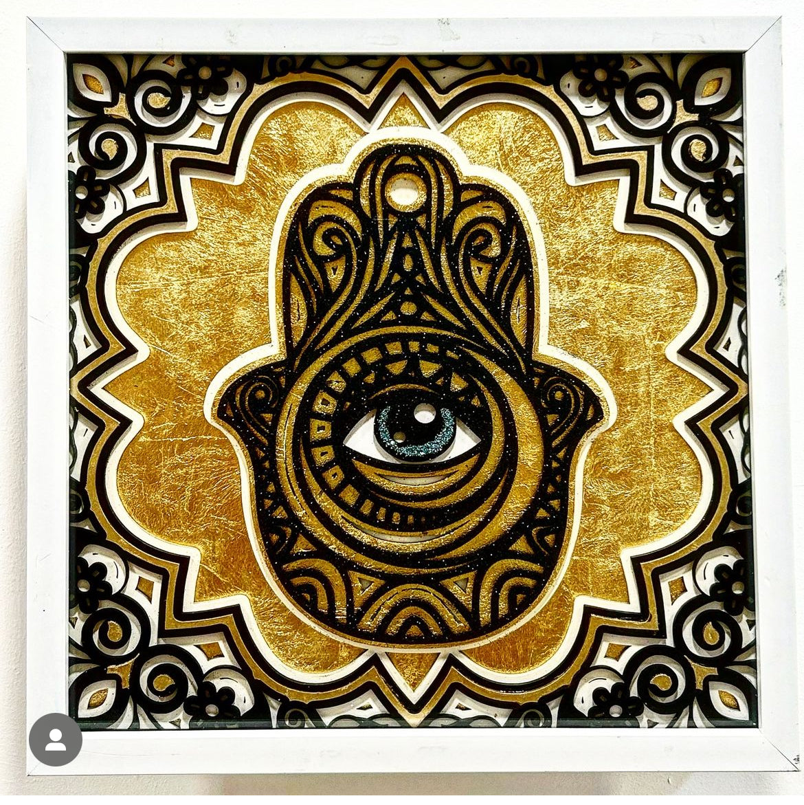 This striking piece features a beautifully intricate black Hamsa design set against a shimmering gold backdrop. At its center, a bold eye symbol draws focus, offering protection and spiritual insight. The ornate patterns surrounding the Hamsa are delicately painted, adding layers of depth and texture to the artwork. Perfect for adding a touch of mysticism and elegance to any space, this unique piece is framed and ready to be displayed.